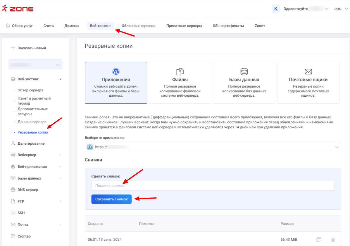 Снимки можно самостоятельно восстановить в панели управления Мой Zone, выбрав Веб-хостинг и Резервные копии.