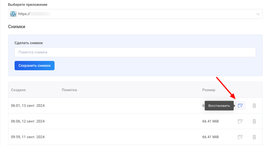 Для восстановления выберите соответствующий снимок из списка и нажмите кнопку Восстановить.