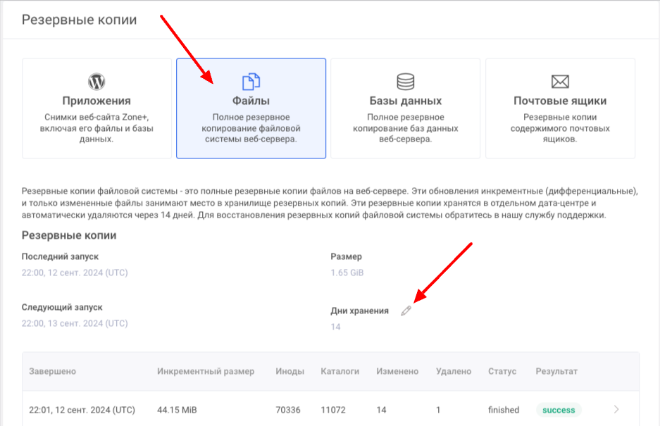 Резервное копирование файлов (резервные копии) выполняется в инкрементной форме, что означает, что если файл не изменился за прошедшее время, то он займет на веб-сервере только столько места, сколько занимает сам файл.