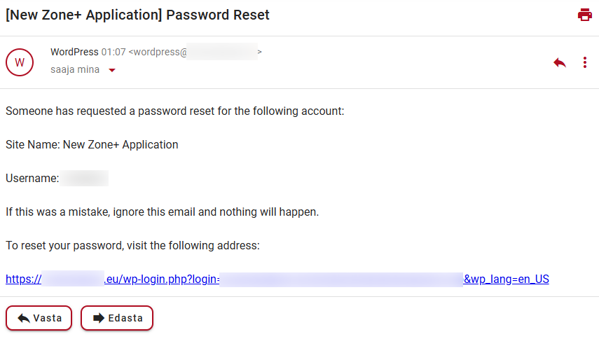При нажатии на кнопку Получить новый пароль, и если были введены правильные имя пользователя или адрес электронной почты, будет отправлено электронное письмо со ссылкой для назначения нового пароля .