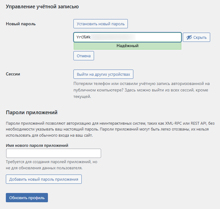 При нажатии на кнопку Установить новый пароль появится окно, в котором вы можете ввести новый пароль или использовать пароль, предоставленный WordPress. После ввода нужного пароля нажмите на кнопку Обновить профиль.