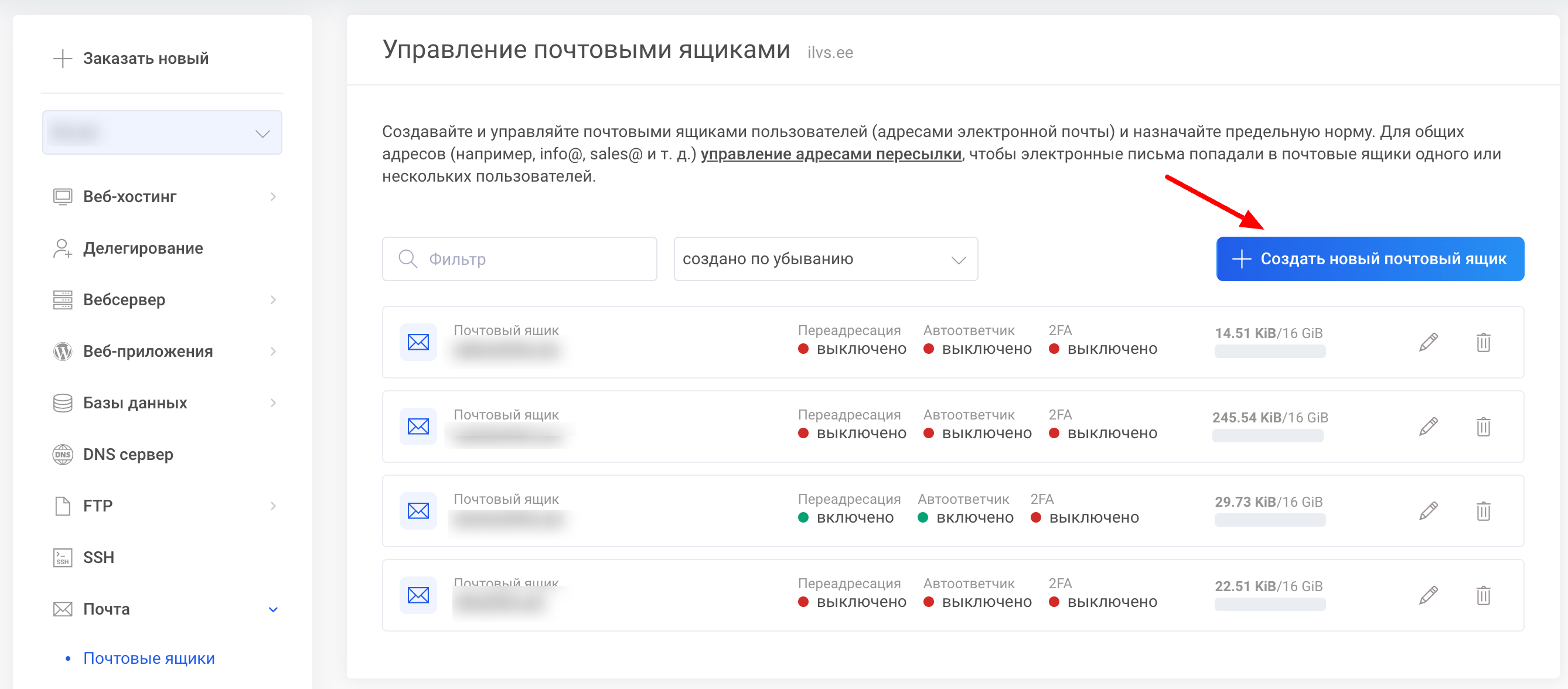 В разделе Почта выберите Почтовые ящики и для добавления почтового ящика нажмите Создать.