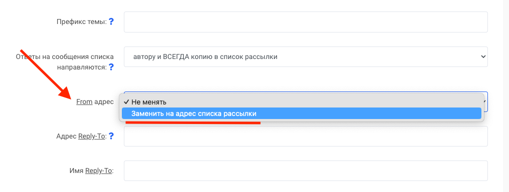 Для того, чтобы избежать этой проблемы, в списке рассылки From адрес можно заменить адресом списка рассылки. Для этого выберите соответствующую опцию в настройках списка рассылки: