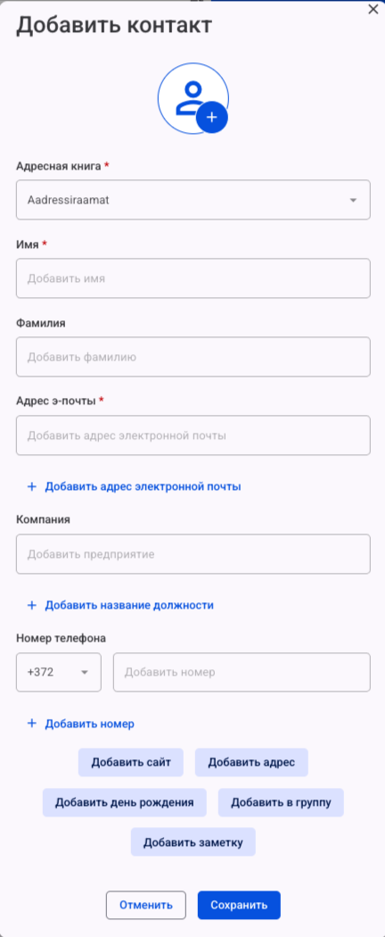 В новом окне выберите адресную книгу, затем введите имя, фамилию и адрес э-почты контакта. При необходимости можно также ввести название компании, должность, номер телефона, день рождения и т. д. После ввода данных нажмите кнопку Сохранить, и контакт будет сохранен в списке контактов.