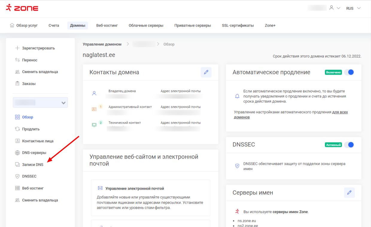 Затем нажмите на Записи DNS в меню слева.