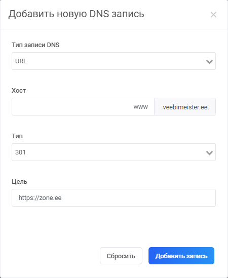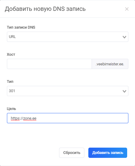 В поле URL нужно указать полный адрес на который Вы желаете переадресовать Ваш домен, например: https://www.zone.ee/