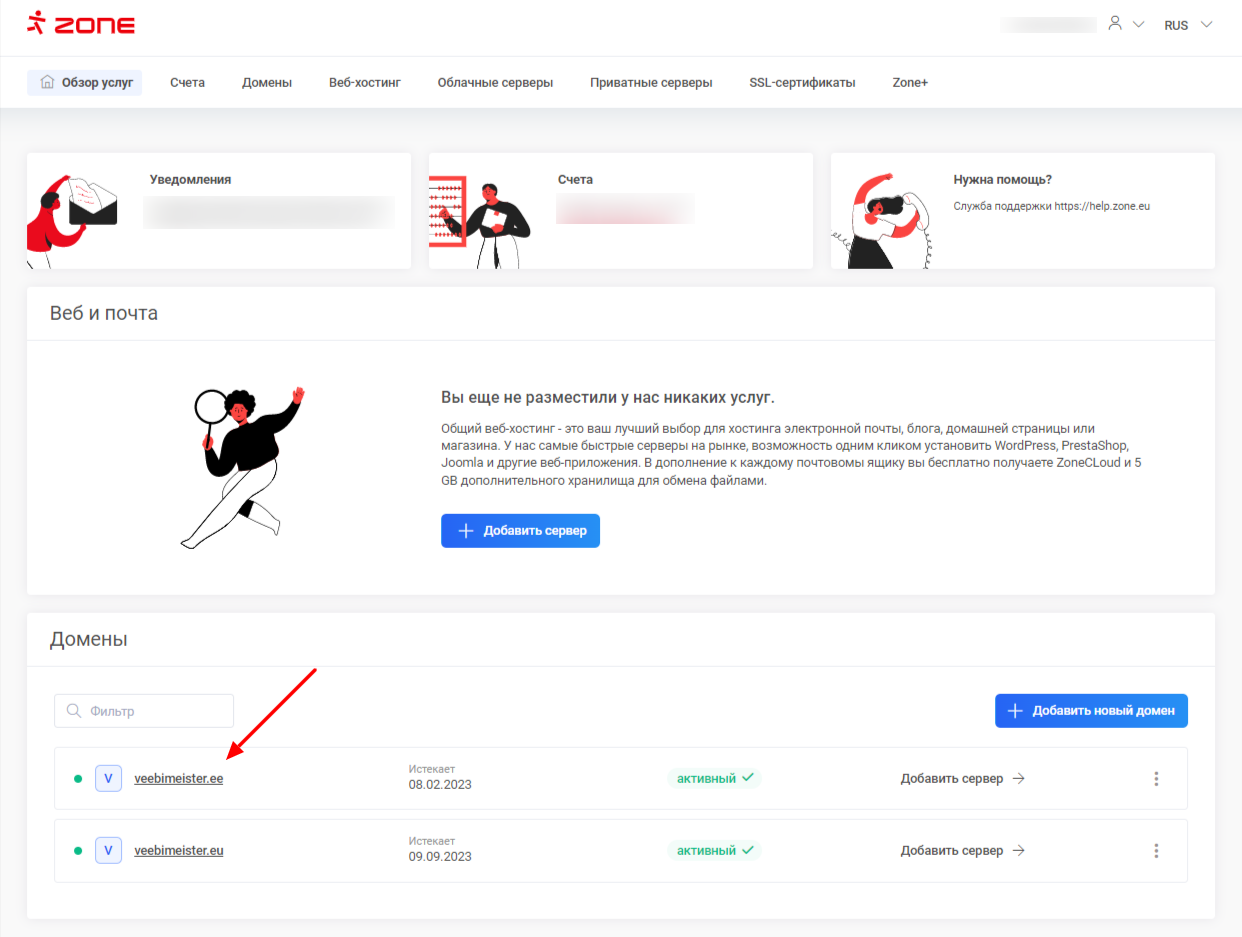 Далее в меню Домены нажмите на домен, который Вы хотите перенаправить.