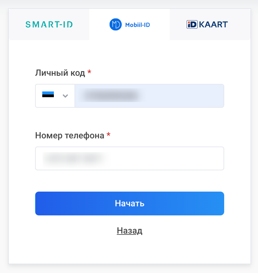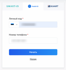 Выберите Mobiil-ID, введите свой личный код, номер телефона и нажмите Начать.