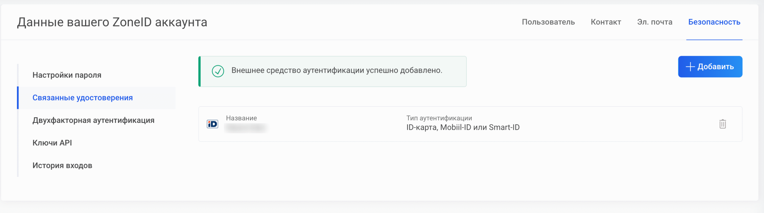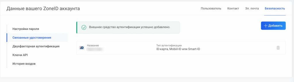 Удостоверение будет подключено к учетной записи и добавлено в список связанных удостоверений.