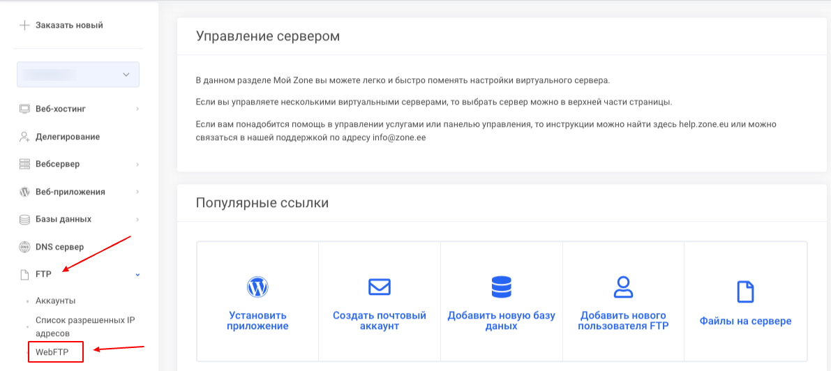 Сначала вам нужно перейти к клиентской программе FTP или WebFTP, чтобы изменить файлы. Чтобы легко менять файлы через самообслуживание Мой Zone, на странице обзора услуг вверху выберите Веб-хостинг → FTP → WebFTP .