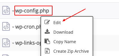 В открывшемся каталоге найдите файл wp-config.php, щелкните его правой кнопкой мыши и выберите Edit.