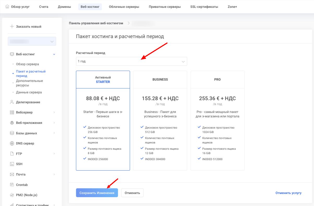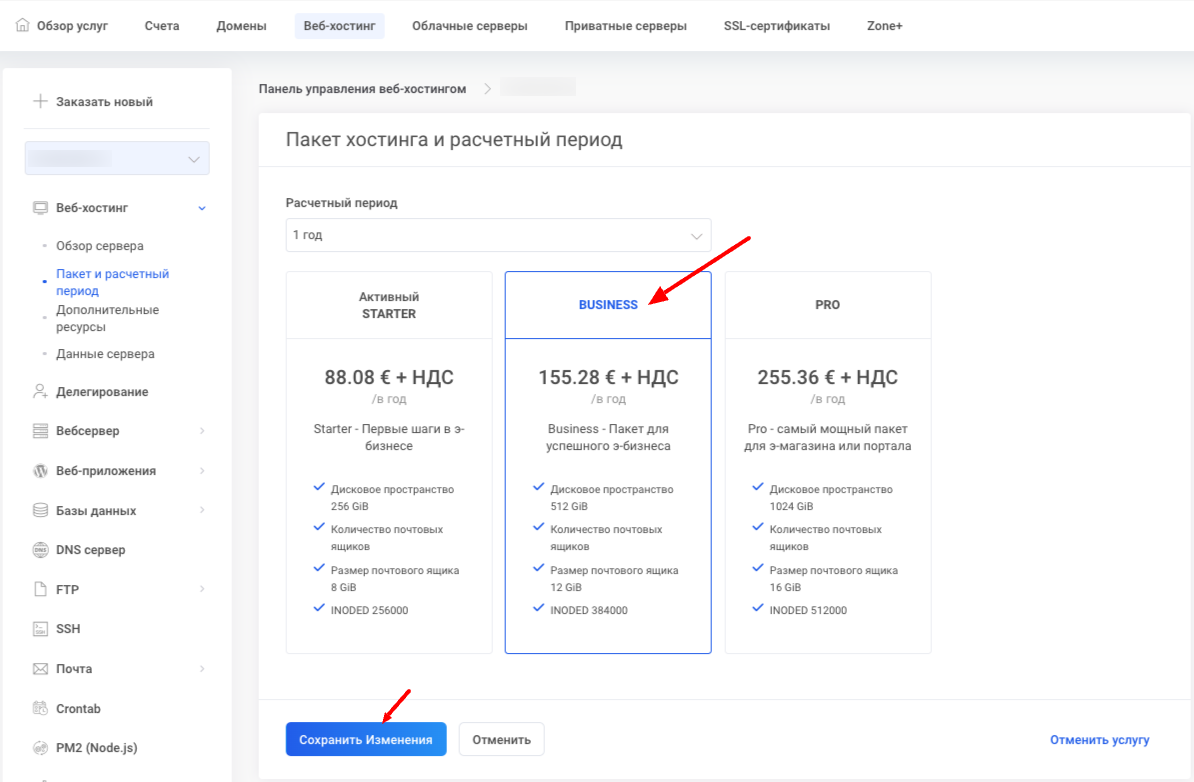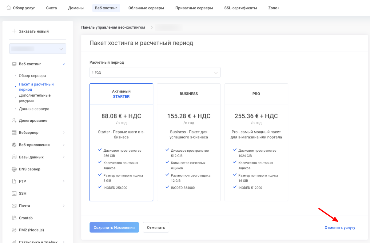 Мой Zone в управлении сервером нажав Веб-хостинг-> Пакет и расчетный период.