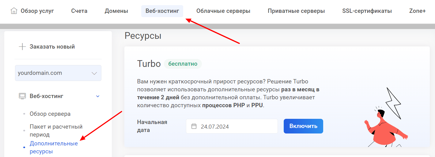 Turbo можно найти в панели управления Мой Zone, выбрав Веб-хостинг. Если в вашем аккаунте есть несколько хостинг пакетов, выберите пакет, для которого вы хотите активировать Turbo, а затем выберите Дополнительные ресурсы в разделе Веб-хостинг.