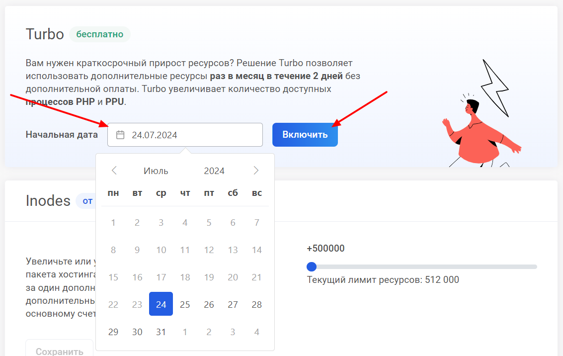Для того, чтобы включить Turbo, сначала выберите начальную дату, когда потребуются дополнительные ресурсы, а затем нажмите кнопку Включить.