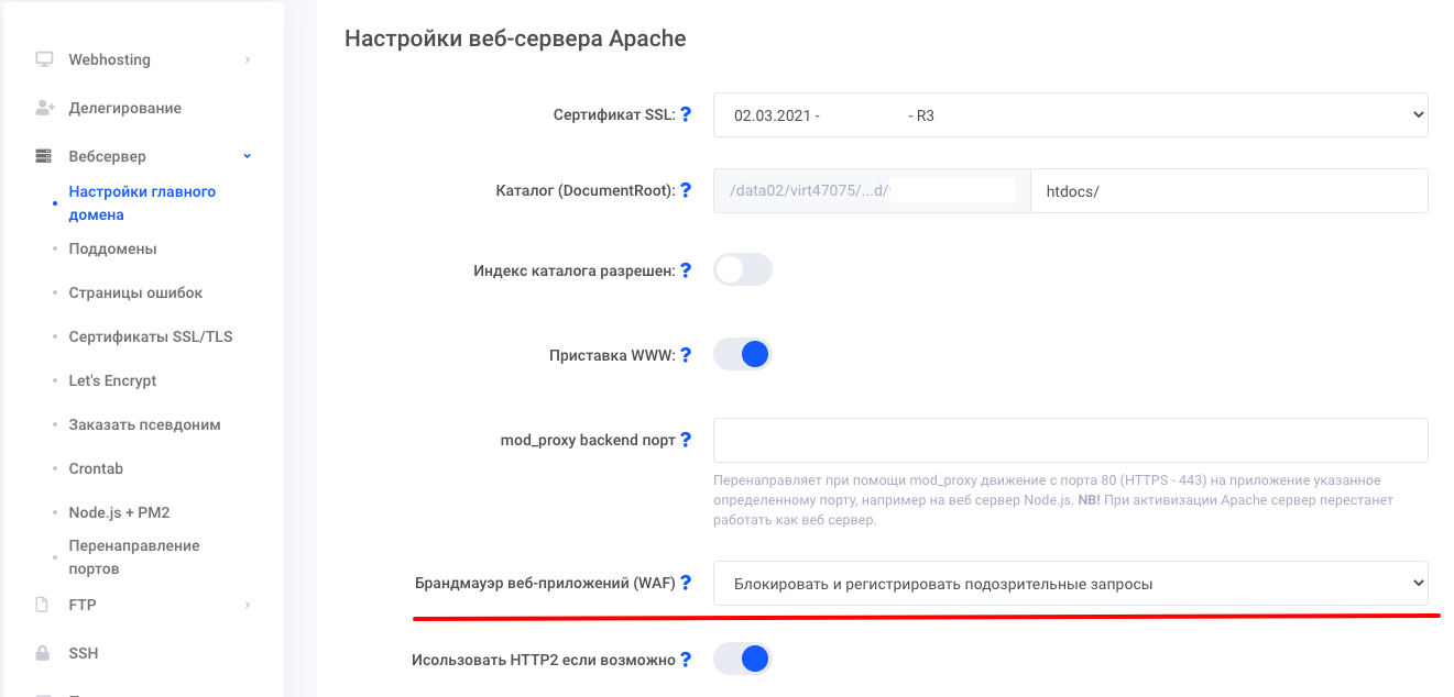На платформе серверов Zone используется ModSecurity и через панель управления можно также активировать правила брандмауэра OWASP ModSecurity Core Rule Set (CRS).