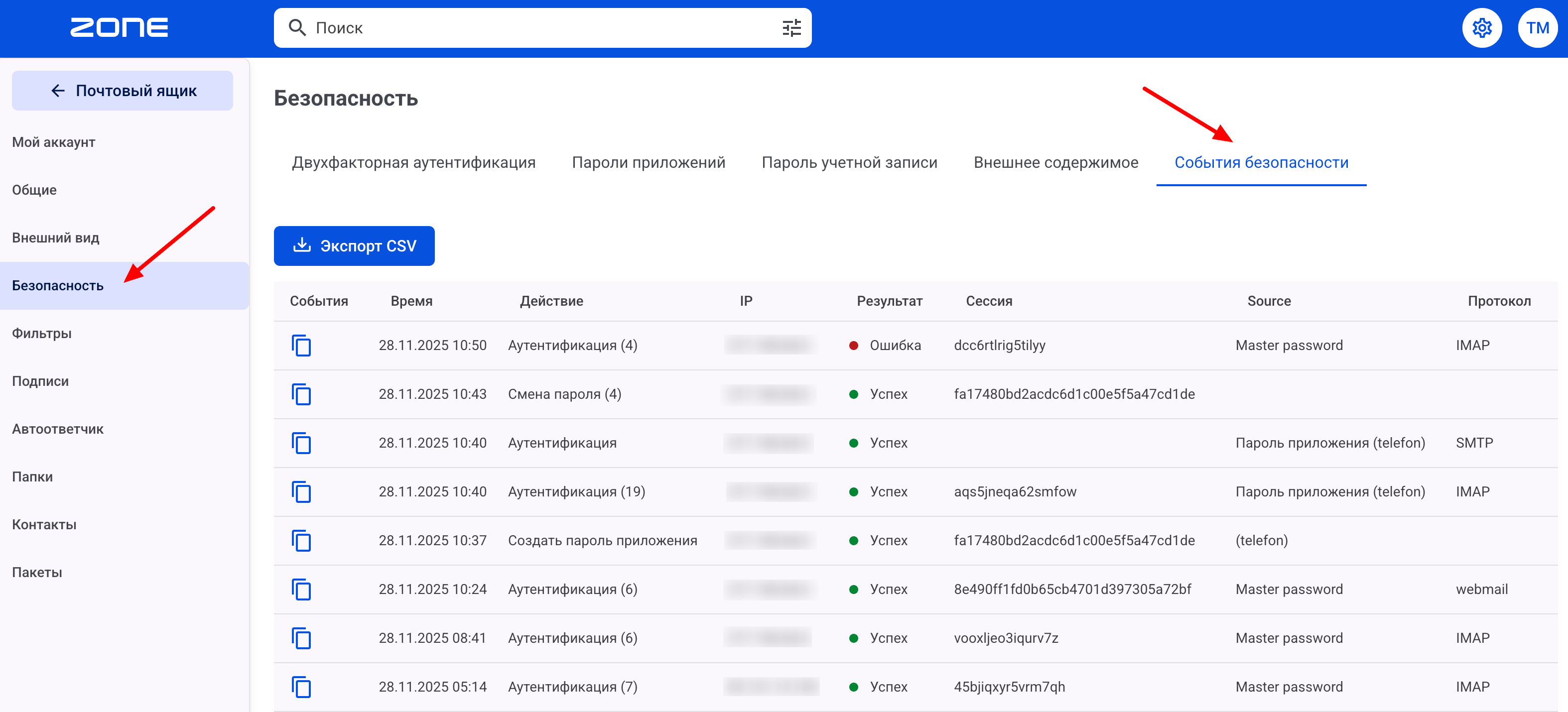 При необходимости пользователь может проверить, откуда и каким способом была произведена аутентификация (или попытка аутентификации) его почтового ящика. Для этого в настройках перейдите в раздел Безопасность -> События безопасности.