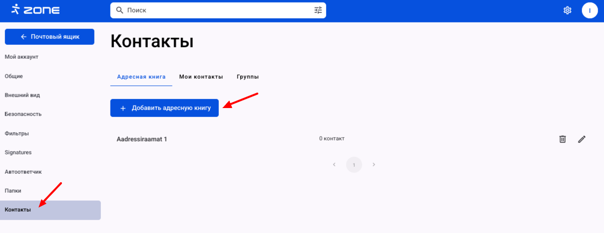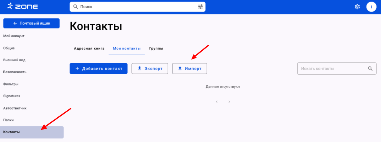Для того, чтобы импортировать контакты, выберите Мои контакты и Импорт.