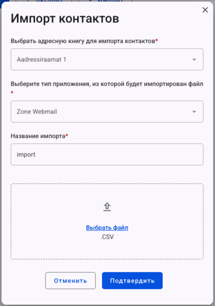 Webmail.ee поддерживает импорт контактов в формате CSV из внешних приложений, таких как Gmail, Outlook, Mac Mail и т.д.. При правильно отформатированном CSV-файле не имеет прямого значения, откуда экспортированы контакты.