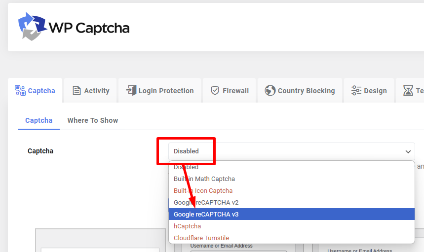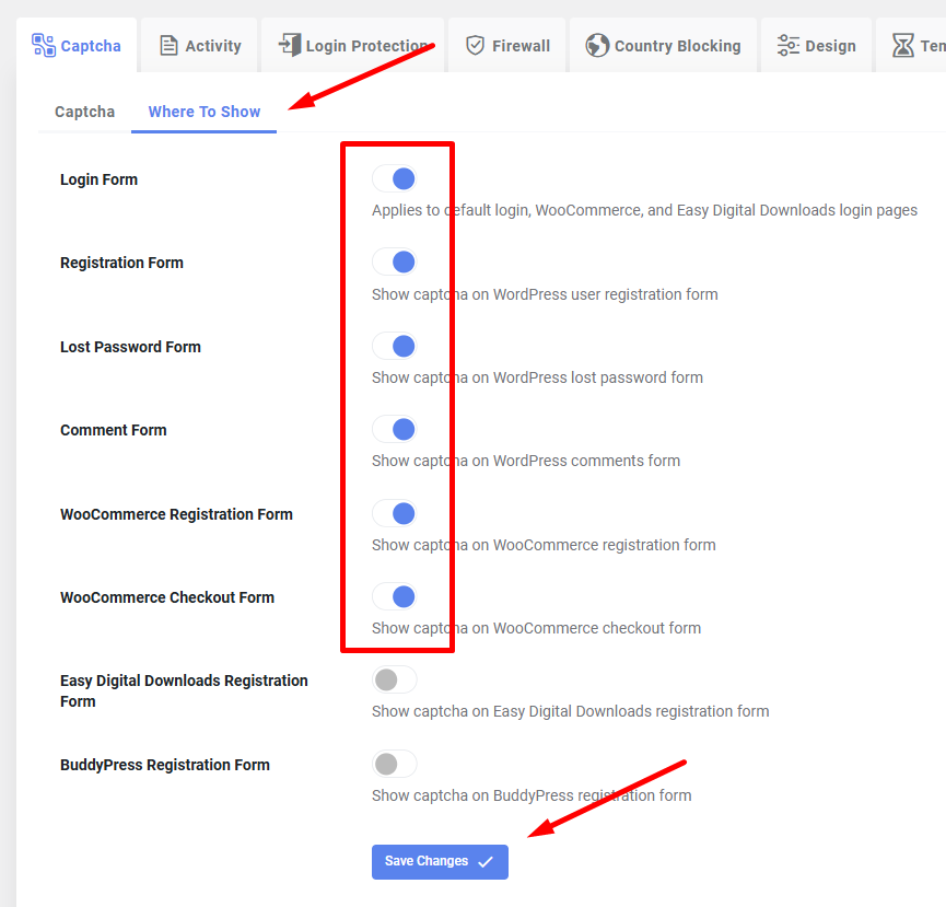 На вкладке Where To Show выберите, какие формы должны быть защищены CAPTCHA.