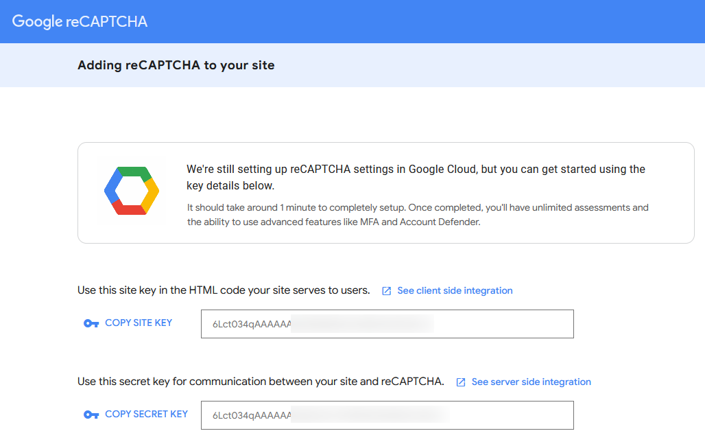 На следующем экране вы увидите пару Site Key и Secret Key. Они будут использованы на следующем этапе для интеграции reCAPTCHA с вашим сайтом. Вы можете просмотреть эти ключи в любое время на панели управления Google reCAPTCHA.