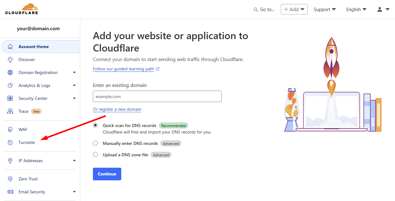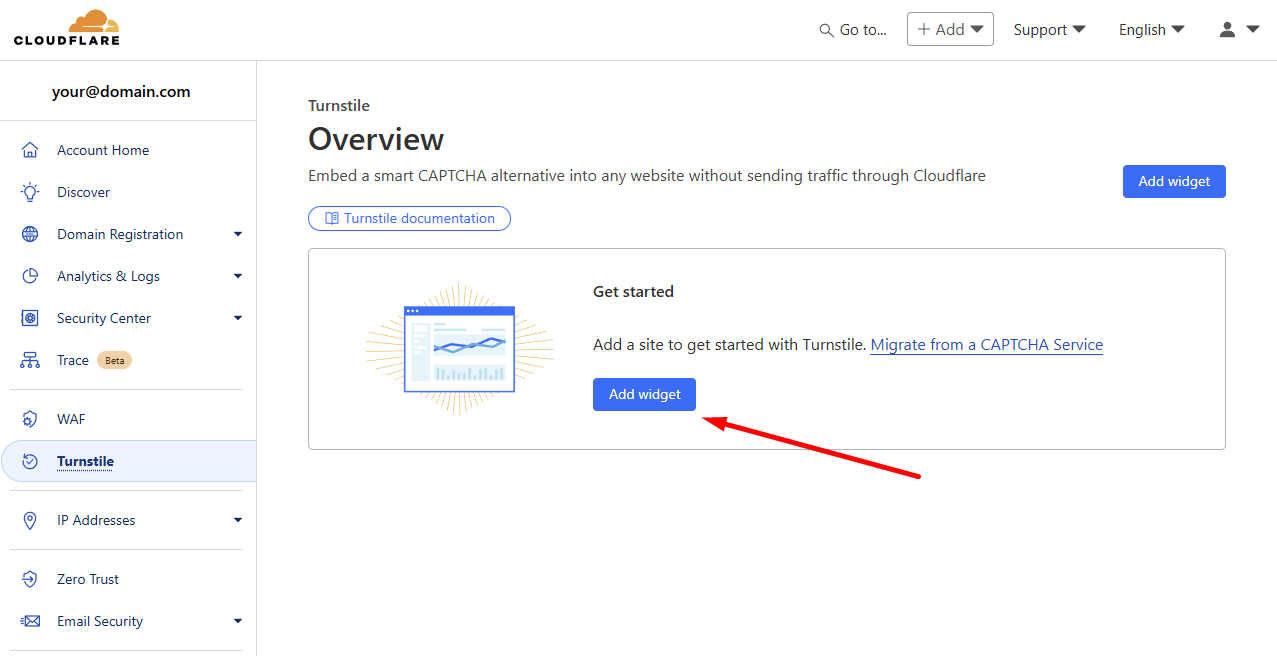 Когда аккаунт будет готов, вы будете перенаправлены в панель управления Cloudflare, где вам нужно перейти в раздел управления Turnstile.