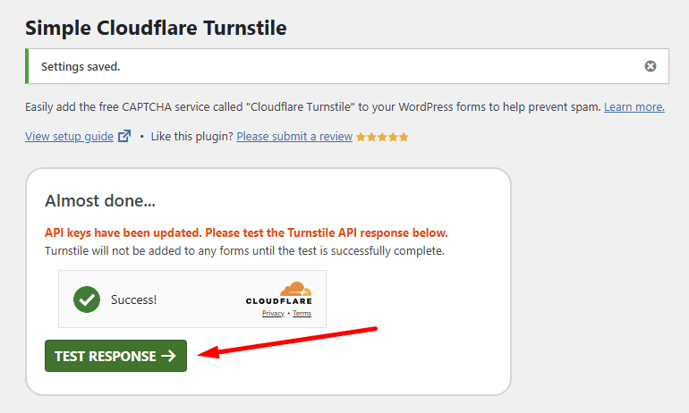 Нажмите зеленую кнопку TEST RESPONSE, которая появится на экране после сохранения изменений. Если проверка прошла успешно, CAPTCHA будет активирована на выбранных ранее формах. В случае неудачи перепроверьте Site Key и Secret Key.