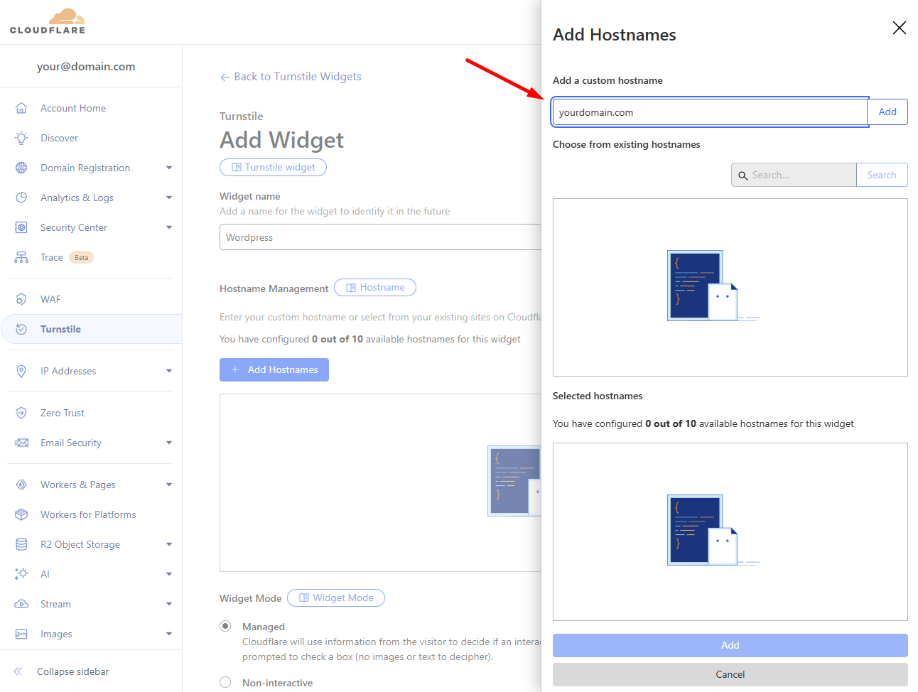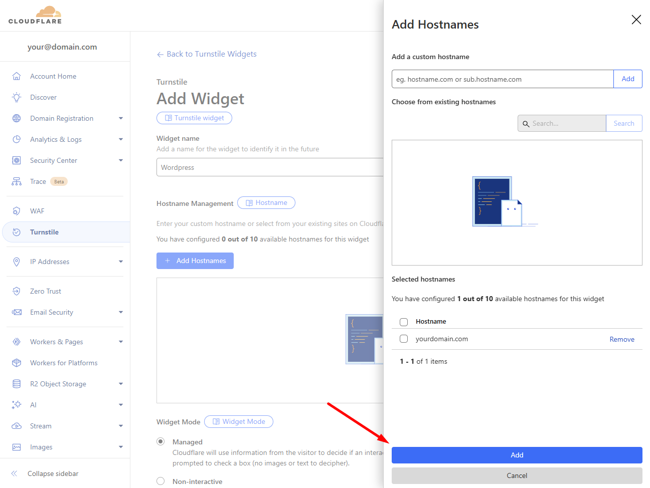 Примечание: Если вы хотите настроить Turnstile для поддомена, укажите имя поддомена в этом шаге. Вы можете добавить до 10 (под)доменов к одному виджету.