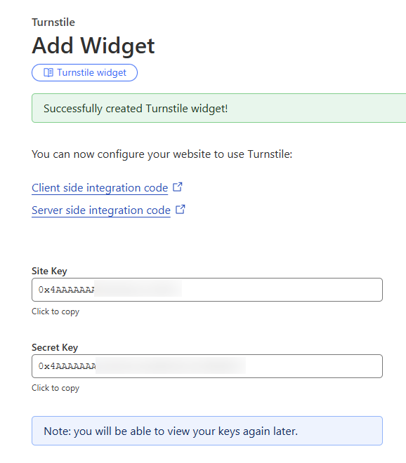 После создания виджета вы увидите пару Site Key и Secret Key. Они понадобятся на следующем шаге для интеграции виджета с вашим сайтом. Вы всегда можете получить доступ или регенерировать эти ключи в панели Cloudflare.