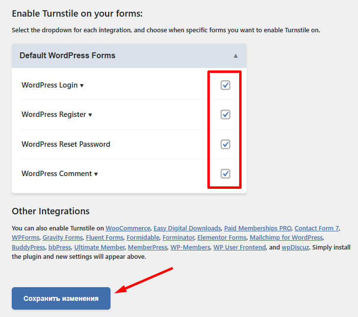 Прокрутите вниз, чтобы выбрать все формы, которые вы хотите защитить. Кроме собственных форм WordPress, вы можете защитить формы других плагинов.